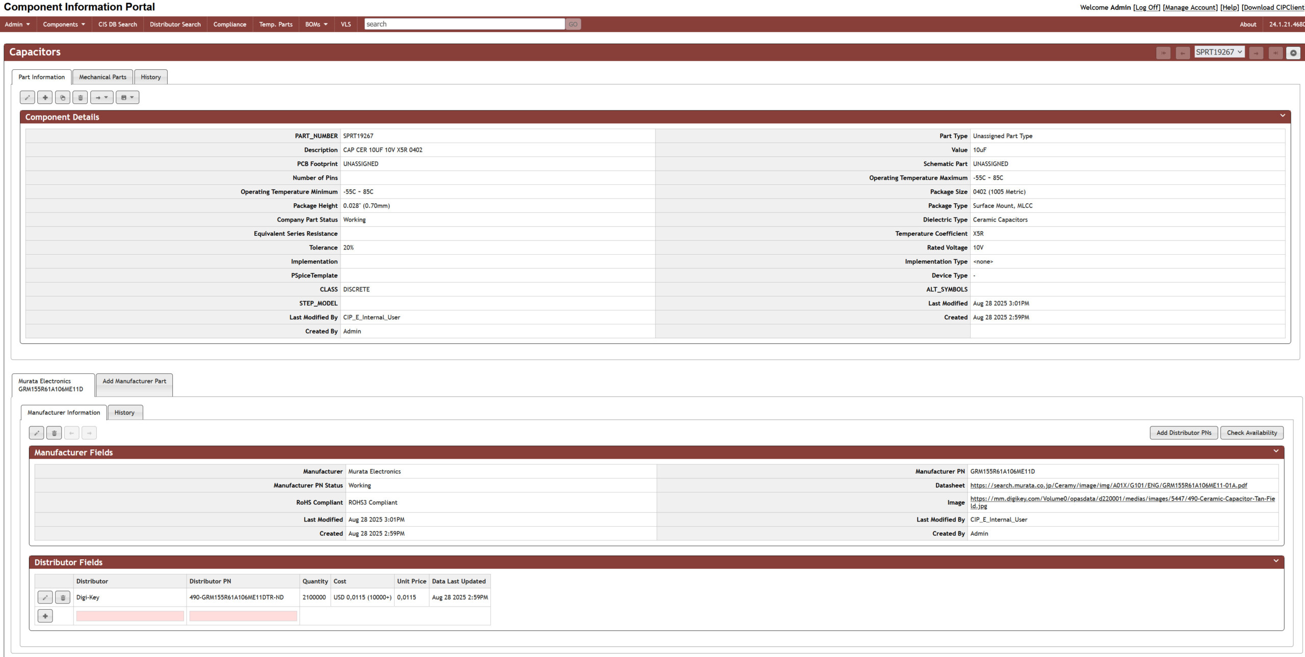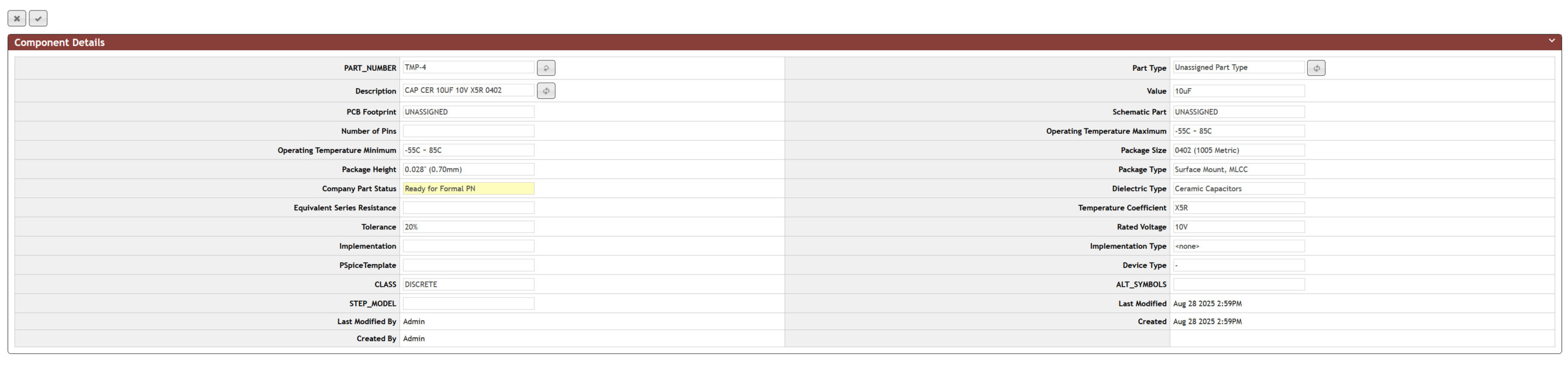Bilde: Redigering av TMP-komponent, hvor Company Part Status settes til "Ready for formal PN".